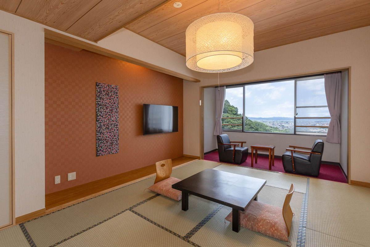 客室はシングルから17.5畳の和室まで多彩。なかでも、プライベート空間で温泉に浸かれる露天風呂付き客室や、眺望が自慢の高層階和室がおすすめです。高層階和室は、情緒豊かな街並みを望む客室と、雄大な山々を仰ぐ客室の2タイプから選択可能。滞在中も至福のひとときを過ごせます。